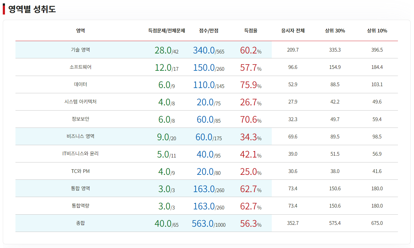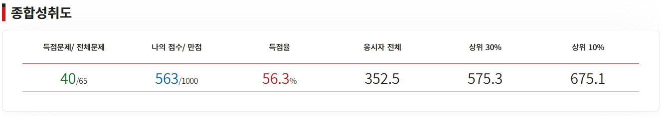 총 65문항 중 40개 득점, 득점률 56.3%, 전체 평균보다 약 200점 이상 높은 성적이었다.