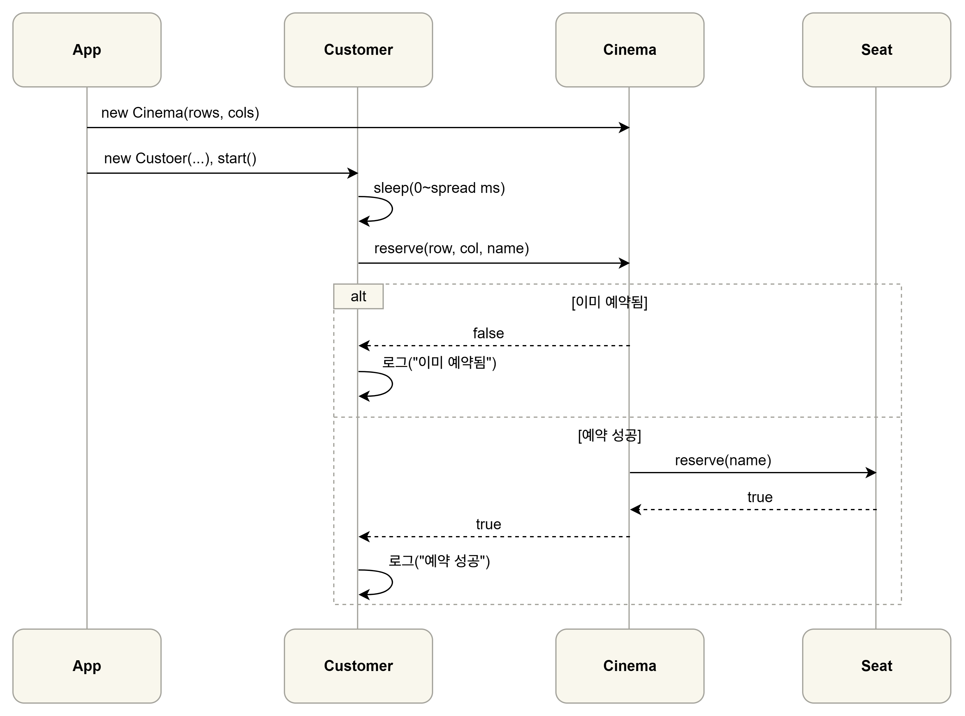 - App: 실행 진입점. Cinema를 생성하고 Customer 스레드를 실행 후 join으로 종료 대기.