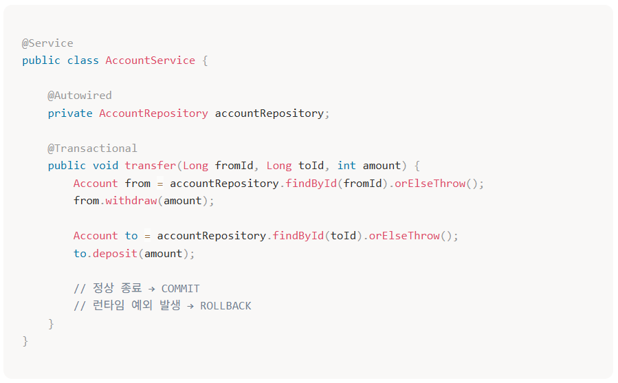 - 런타임 예외(RuntimeException) 발생 시 → 자동 ROLLBACK