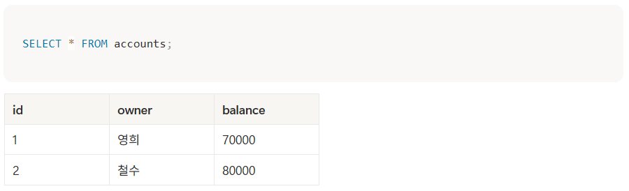 - 두 UPDATE 모두 성공해야 의미가 있으며, COMMIT이 있어야 DB에 확정된다.